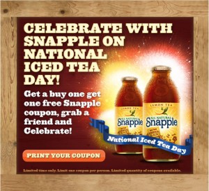 “Like” Snapple on Facebook, then click on their Iced Tea Day tab to print out the coupon.