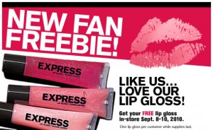 “Like” Express on Facebook August 30 – September 3 and you will be able to fill out a form to get a coupon good for a free lip gloss in store September 8-10.